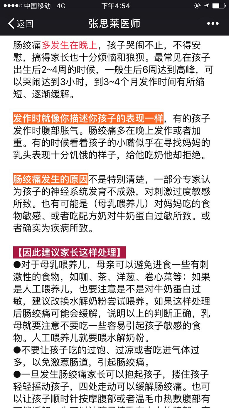 宝宝两个月零4天,一个半月的时间发生过一次肠绞痛,突然的嚎啕大哭让我们措手不及,各种都哄不好,喂奶边吃边吐奶头,直跺脚,哭了大半个小时,看着真心痛。之后隔了三天左右又一次;没办法去医院看,医生说没办法,配了点健脾养胃中药颗粒,益生菌(说吃母乳大便四五天一次的,有点偏少);再后来连着三天都是差不多时间(晚上)开始哭闹,又是肠绞痛惹的祸,真是无奈。查了很多资料,尝试着飞机抱,竖抱,排气操,都不见啥明显改善,求各路网友支招,为人母真心不愿看见宝宝这么撕心裂肺的哭,心累