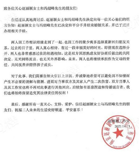 4月23日上午,赵丽颖工作室与冯绍峰工作室同时宣布二人离婚,并于近日办理相关手续,两人未来继续承担作为父母的责任,共同抚养并陪伴孩子成长!