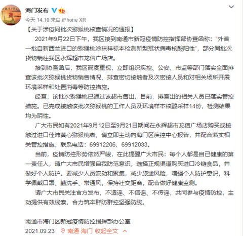 今天下午,江苏省南通市海门区新冠疫情防控指挥部办公室通报了一批涉疫猕猴桃,销售地点涉及永辉超市,提醒近期购买此批次猕猴桃的顾客,尽快报告并配合落实相关疫情管控措施。 【关于涉疫同批次猕猴桃核查情况的通报】 2021年9月22日下午,我区接到南通市新冠疫情防控指挥部协查函称:“外省一批自新西兰进口的猕猴桃涂抹样标本检测新型冠状病毒核酸阳性”,部分同批次货物销往我区永辉超市龙信广场店。 接到协查函后,
