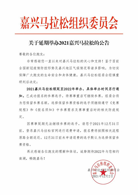官宣了!2021嘉兴马拉松将延期至2022年举办!