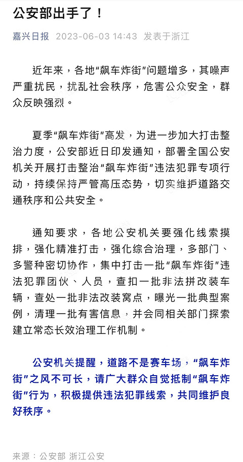 近年来,各地“飙车炸街”问题增多,其噪声严重扰民,扰乱社会秩序,危害公众安全,群众反映强烈。 夏季“飙车炸街”高发,为进一步加大打击整治力度,公安部近日印发通知,部署全国公安机关开展打击整治“飙车炸街”违法犯罪专项行动,持续保持严管高压态势,切实维护道路交通秩序和公共安全。 通知要求,各地公安机关要强化线索摸排,强化精准打击,强化综合治理,多部门、多警种密切协作,集中打击一批“飙车炸街”违法犯罪团
