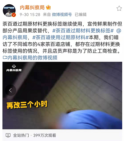 每天靠奶茶“续命”的你,想过它们真的干净卫生吗? 9月30日晚,#茶百道使用过期原材料# 登上热搜。 博主@内幕纠察局 暗访不同城市的4家茶百道店铺,发现都存在过期材料更换标签使用,宣传鲜果制作但部分产品用果浆替代的情况,并且店员声称是为了防止监管部门检查。 10月1日凌晨0点,茶百道发布致歉信。 茶百道不止一次在抽检中表现欠佳 茶百道官网显示,该品牌隶属于四川蜀信致远企业管理咨询有限公司,从20