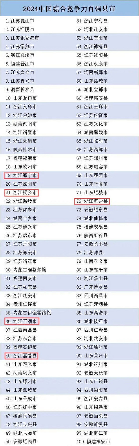 2024中国百强县市榜单发布!嘉兴上榜几个?