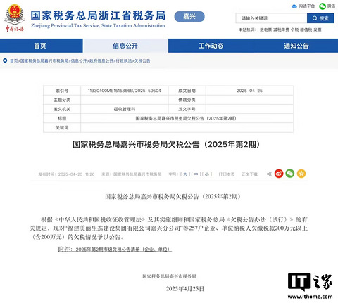 IT之家 5 月 6 日消息,国家税务总局浙江省税务局网站于 4 月 25 日发布《国家税务总局嘉兴市税务局欠税公告(2025 年第 2 期)》,其中哪吒汽车关联公司合众新能源汽车股份有限公司新增三则欠税公告,欠税总金额为 215 万余元,当前新发生的欠税余额合计 215 万余元,欠税税种为城镇土地使用税、印花税、房产税。 IT之家注意到,合众新能源汽车股份有限公司成立于 2014 年 10 月,