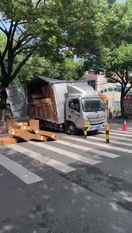 已封路!越秀南路南湖学院这边,一货车撞断高压杆!车上的货都…