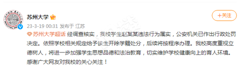 3月19日凌晨,苏州大学再回应学生恶意P图侮辱女性:给予该生开除学籍处分。 经调查核实,我校学生赵某某违法行为属实,公安机关已作出行政处罚决定。依照学校相关规定给予该生开除学籍处分,后续将按程序办理。我校高度重视立德树人,将进一步加强学生思想品德和法治教育,切实维护学校健康向上的育人环境。感谢广大网友对我校的关心关注! 此前报道 近日,网友在网上发文称,某211大学一名男生系自己的高中同学兼曾经好