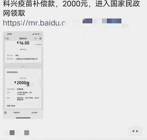 小编最新获悉 网络上最近出现了一种 利用新冠疫苗进行诈骗的 新型诈骗手段 大概内容是 接种科兴疫苗的人 凭接种证明可以领取每人2000元的补助 结尾附上一个链接! (图片来源:网络) 警方提醒: 这是新型骗局! 不要相信!不要相信!不要相信! 不要点击可疑网页链接 也不要随意向对方汇款、转账 避免上当受骗! 目前全国各地正有序开展新冠病毒疫苗接种 而一些不法分子通过微信、QQ、手机短信 发送疫苗接