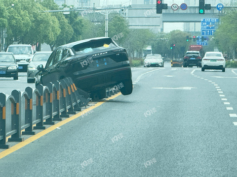 由拳路车城路附近,刚刚一辆新车撞护栏了