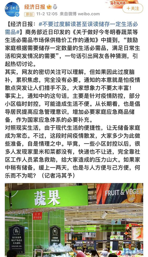 商务部近日印发的《关于做好今冬明春蔬菜等生活必需品市场保供稳价工作的通知》中提到,“鼓励家庭根据需要储存一定数量的生活必需品,满足日常生活和突发情况的需要”。 今天中午,@经济日报 发文《不要过度解读甚至误读储存一定生活必需品》。其中提到:“网友的密切关注可以理解,但如果因此过度脑补,累积焦虑,完全没有必要。通知的本意就是怕疫情散点突发让人们措手不及,大家想象力不要太丰富!” @经济日报 微博截图