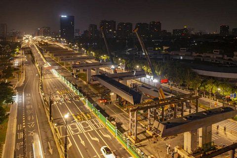 快速路百日攻坚捷报频传! 昨晚,在市区中环西路—东升路交叉口,由中建三局和宏润建设联合承建的施工1标段全线首片钢箱梁启动架设,标志着三期一阶段工程开始进行上部结构施工。 据悉,三期一阶段工程全线共设计预制箱梁1447片,钢箱梁13245吨,主线高架上部结构施工主要采用吊装工艺。本次架设的首片钢箱梁跨径29米,重55吨左右。三期一阶段工程施工1标相关负责人介绍,钢箱梁采用工厂制作后运输至现场吊装,与