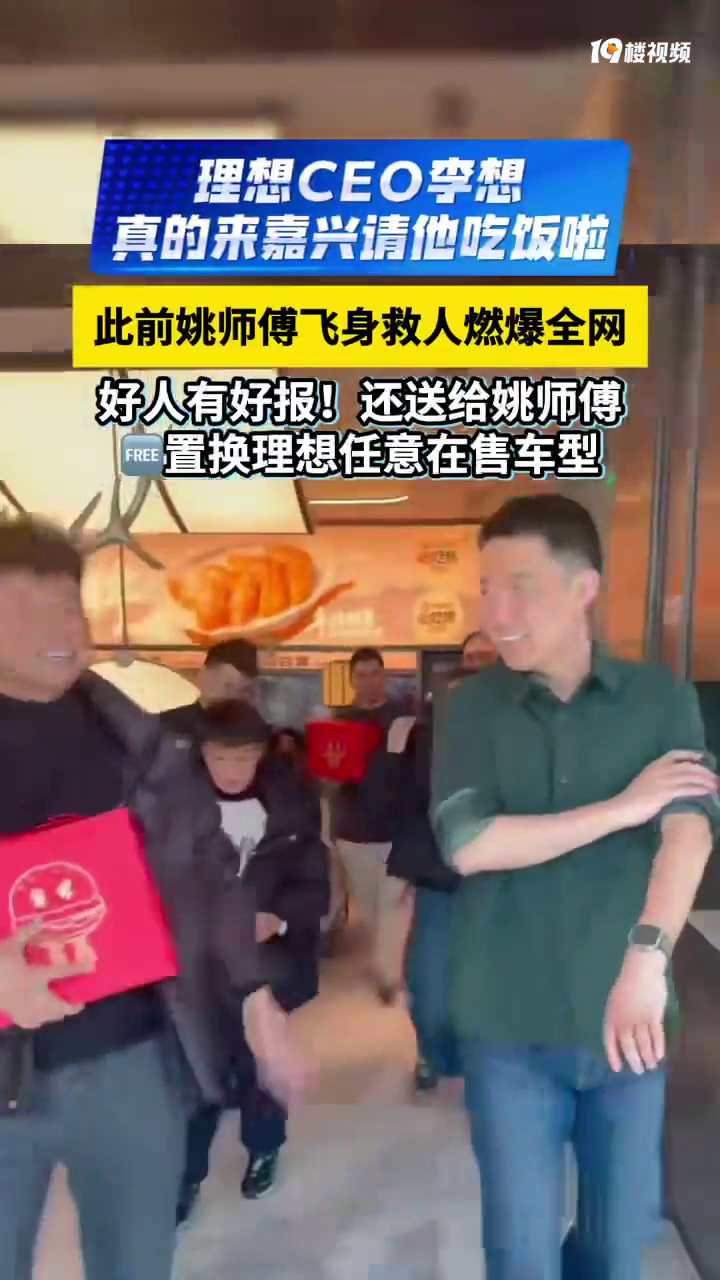 还记得姚师傅飞奔救人么?1月27日中午12点07分,浙江海盐县西塘桥街道西塘大桥发生惊险一幕:一女子欲跳桥轻生路过的浙FFJ3808车主见状急刹飞奔,一把拉回轻生女子这段救人视频刷屏全网!1月31日,理想CEO李想在微博发文称:“看他飞奔下车的样子,真帅!如果谁能联系上车主,能不能帮我转告一下,我可不可以去请他吃个饭?”昨天2月12日,理想老板李想真的来海盐请姚师傅吃饭了!现场视频: 这不仅仅是一