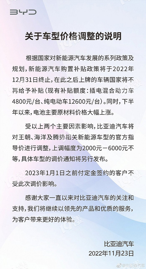 在特斯拉引发新能源汽车降价潮的关口,比亚迪选择成为这波潮流的逆行者。 比亚迪发布《关于车型价格调整的声明》称,“将对王朝、海洋及腾势相关新能源车型的官方指导价进行调整,上调幅度为2000元至6000元不等,具体车型的调价通知将另行发布。2023年1月1日之前付定金签约的客户不受此次调价影响。” 在该声明中,比亚迪表示,涨价主要受两方面原因影响,一是新能源汽车购置补贴政策即将于2022年12月31日