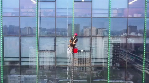 烈日当头,有些工作是没法给自己撑阳伞的,比如在高楼上从事户外作业的蜘蛛人。今天我们就去认识其中的两个。 市区洪波路和中环西路交叉口的一幢大楼有27层高。吊在外面的工人叫邓晓峰,36岁,云南昭通人,小学没读过几天书,干一行已经十几年。这两天,他和两个工友一起在检修新装的灯带。大楼的夜景就是靠这些灯带来装饰,每天挂在上百米的高空,会不会头晕呢? “蜘蛛人 ” 邓晓峰 :最开始还是害怕的,每个人都一