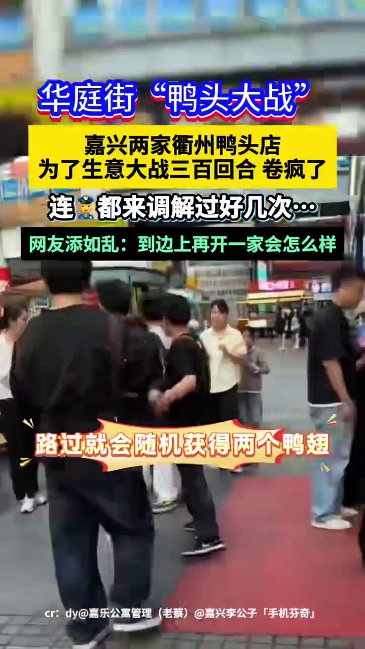 都说做生意和气生财嘛! 但是同一条街上要是开了两家一样生意的店 那朴实无华的商战立刻就来了… 去年两家炒货店吵, 今年鸭货店吵… 现场场面太混乱! 嘉兴市中心两家鸭头店相邻 为了生意直接抢客?大喇叭互相挑衅 最近甚至大打出手?! ▽ 嘉兴超多网友发视频爆料: 华庭街老底子嘉兴人 肯定都不陌生,老早的时候超热闹 现在里面商业街 就隔壁连着开了两家衢州鸭头 一家红门头,一家黄门头 谁也没想到两家一样的