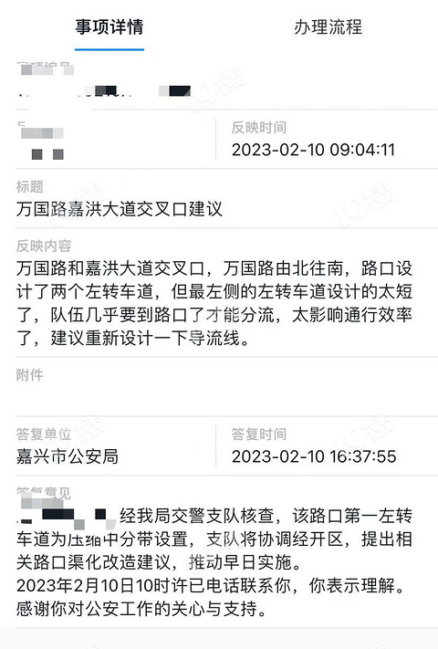 之前万国路由北向东左转到嘉杭路的左转车道设计的不太合理,高峰期都要堵好远。最近改造了一下感觉通畅了好多,有没有这个位置每天通勤的小伙伴也有同样的感觉?今年2月浙里办里提的建议,9月改造完成,虽说时间有点长,但走流程审批之类的估计也差不多,嘉兴的政务还是给力的!