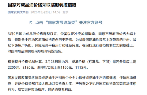 国家对成品油价格采取临时调控措施 记者从国家发展改革委获悉:3月9日国内成品油价格调整以来,受美以伊冲突加剧影响,国际市场原油价格大幅上涨,特别是中东地区原油价格连创历史新高。为减缓国际油价异常上涨带来的冲击,减轻下游用户负担,保障经济平稳运行和社会民生,在保持现行价格机制框架的基础上,对国内成品油价格采取临时调控措施。 根据现行价格机制计算,自3月23日24时起,国内汽、柴油价格(标准品)每吨分