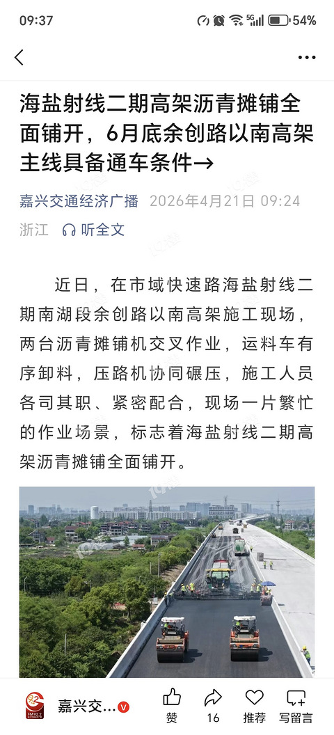 海盐射线高架二期6月底可能通车了。那通车后余沈线就不会那么堵了。 —— 【完整报道:海盐射线二期高架沥青摊铺全面铺开,6月底余创路以南高架主线具备通车条件→】 近日,在市域快速路海盐射线二期南湖段余创路以南高架施工现场,两台沥青摊铺机交叉作业,运料车有序卸料,压路机协同碾压,施工人员各司其职、紧密配合,现场一片繁忙的作业场景,标志着海盐射线二期高架沥青摊铺全面铺开。 近期天气多变,嘉通集团快速路公