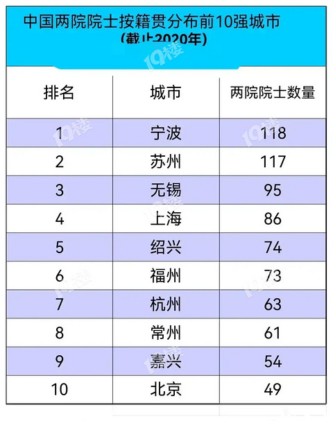 中国两院院士籍贯分布排名,前十浙江占了四个,北京排名令人意外,浙江宁波排名第一,苏州以一人只差排名第二,江浙沪前十占了七个,厉害!