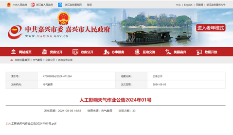小编了解到嘉兴市人民政府网站发布了人工影响天气作业公告2024年01号 经市人民政府同意,嘉兴市人工影响天气工作领导小组办公室决定于2024年8月5日-2024年8月31日,适时实施人工影响天气作业,以缓解旱情需求为目的。有关事项公告如下: 1.作业时间:2024年08月05日-2024年08月31日; 2.作业地点:经空域管制部门批准的海宁市黄湾镇安江路(嘉兴1号作业点)、海盐县百步镇得胜村(嘉