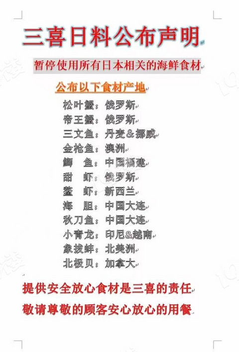 今天的新闻,海关总署全面暂停进口原产地为日本的水产品。高端日料店们不知道以后会怎么发展。刷了下朋友圈,发现嘉兴日料店的求生欲满满,已经出公告了,换材料。