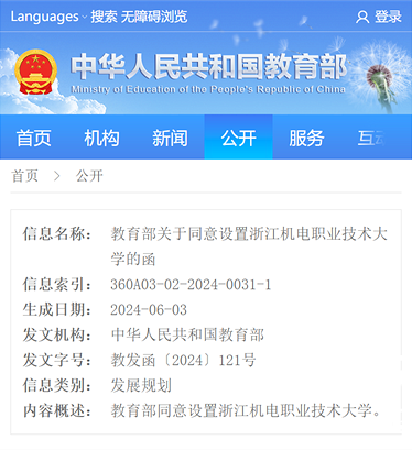 教育部官网6月27日发布最新消息教育部同意设置浙江机电职业技术大学↓↓↓ 教育部关于同意设置浙江机电职业技术大学的函教发函〔2024〕121号 浙江省人民政府: 《浙江省人民政府关于商请设立浙江机电职业技术大学的函》(浙政函〔2023〕117号)收悉。根据《中华人民共和国高等教育法》《中华人民共和国职业教育法》《普通高等学校设置暂行条例》等有关规定以及第八届全国高等学校设置评议委员会评议结果,经教