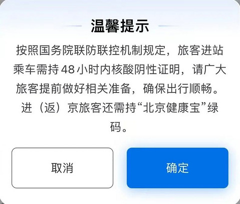 按照国务院联防联控机制规定,自2022年11月17日零时起,旅客进站乘车需持48小时内核酸阴性证明,请广大旅客提前做好相关准备,确保出行顺畅。进(返)京旅客还需持“北京健康宝”绿码。 *对于站内换乘旅客,不重复查验核酸检测证明。 *检测报告纸质版、电子版均有效。 *如地方政策严于国务院政策,以地方政策为准;如地方政策宽于国务院政策,以国务院政策为准。 互联网购票温馨提示 ↓ 为了保证您出行顺利,
