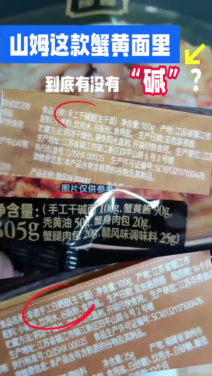 “外包装和内包装上写的是‘手工干碱面’,内部装面条的小包装上写的是‘非遗手工日晒面(生干面)’,配料表上又没写含食用碱。”8月11日,读者潘先生向南湖晚报栏目报料,称他于8月5日在山姆会员商店(嘉兴店)购买了一款名为“蟹四宝蟹黄面”的商品后,发现内外三重包装的标签存在不一致的情况,此外还发现配料表存在加贴行为。潘先生发问:“这款面到底有没有添加食用碱?” 连日来,晚报记者对此进行了多方采访。 顾客