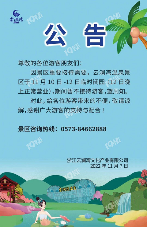 因景区重要接待需要,云澜湾温泉景区于 11 月 10 日 -12 日临时闭园!12 日晚上正常营业!期间暂不接待游客有人知道是啥原因不