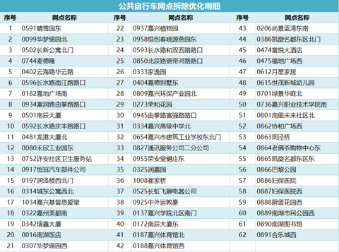 【关于公共自行车网点拆除优化的通告】 因城市道路施工及网点优化需要,自2023年9月15日起,62个公共自行车网点将进行拆除优化,具体如下: 拆除后将根据实际情况确定新增点位和数量。 来源丨嘉兴市公共交通有限公司