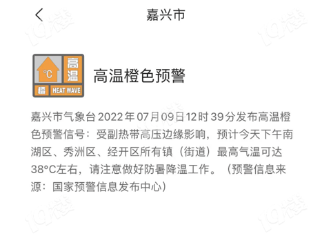嘉兴市气象台2022年07月09日12时39分发布高温橙色预警信号: 受副热带高压边缘影响,预计今天下午南湖区、秀洲区、经开区所有镇(街道)最高气温可达38℃左右,请注意做好防暑降温工作。 (信息来源:国家预警发布中心)