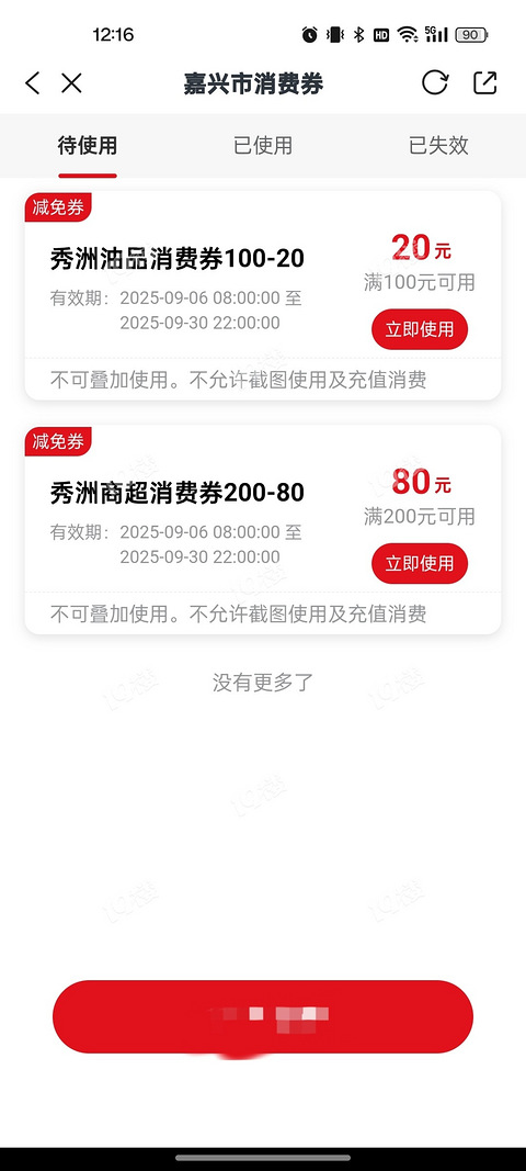 昨天在看秀洲APP上看到可以预约消费券,哐哐全点上预约,也没想能中,毕竟看公众号评论里好多人都说从没中过。刚想起来去看看,没想到中了两个,不错,挺够意思了