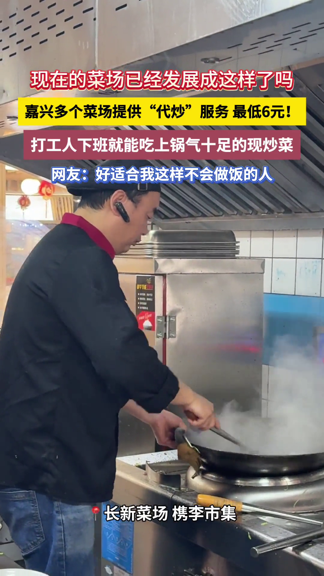 前段时间看到嘉兴的①长新农贸市场和②槜李市集都推出了菜场代炒的服务!19楼(不会做饭的小编之一)必须带上大家去体验体验这个新型服务到底怎么样!实不实惠!好不好吃!GOGOGO !出发咯~~~ 升级后的长新农贸市场(在姚家荡路上)确实不一般哈!环境特别好! 进门一左转就能看到代炒的窗口啦显示屏上能看到代炒的明码标价 1、素菜类——6元/份2、半荤素——10元/份3、全荤类——15元/份4、海鲜类——