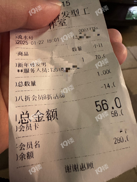 昨天去经常理发的店理发,平时还是充值办了会员,洗剪吹不到15分钟结帐,一看账单吓一跳,要是没有会员得70元,会员也要56元! 这贵的有点离谱了!
