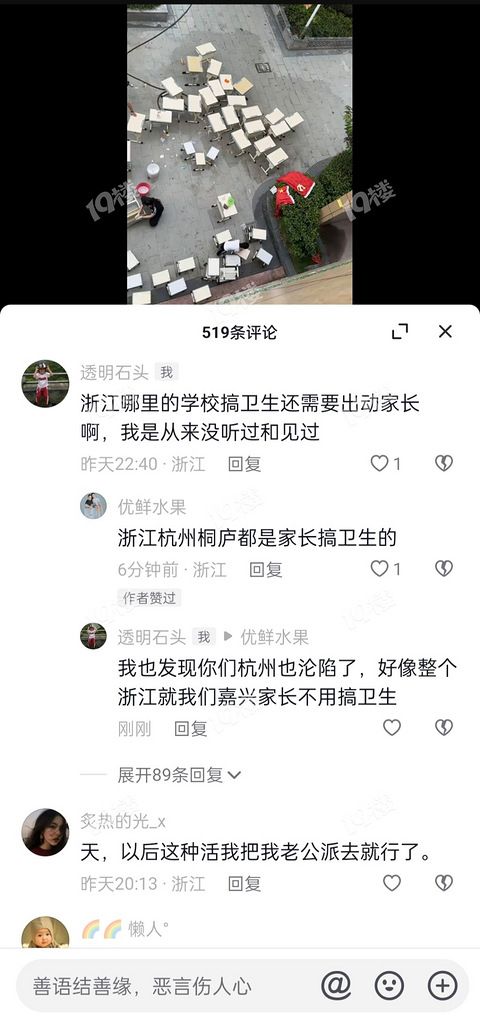 刷个抖音真是让我开了眼,孩子开学居然让家长去搞卫生的,评论区更是震碎了我的三观,好像整个浙江只有我们嘉兴家长不用去搞卫生的,我都已经放话了,嘉兴开学家长不用去搞卫生,以防万一来19楼问一下,反正我是嘉善的,娃也五年级了,身边从来没听说过需要家长去搞卫生的,嘉兴五县两区有没有需要家长搞卫生的学校
