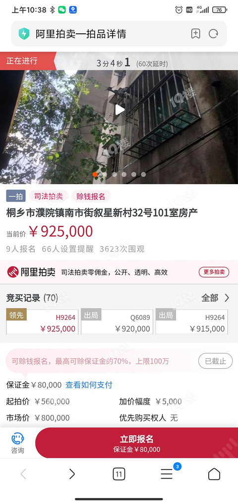 市场价80万,起拍56万,拍到了92.5万还在继续