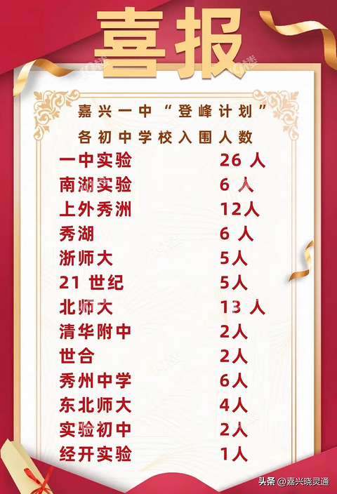 嘉兴一中登峰计划录取结果已出,市本级各初中录取人数如图1所示,很多人看到这个数据,以为这是头部顶尖学生的实力,代表各学校的教育质量和水平,实际上并非如此。理由如下: 1.登峰计划招生对象是面对初二的学生,但考试范围是整个初中甚至高中的知识点。录取名额90人,听说有2000多位学生报名参加考试。如果想要突围,肯定要提前学初三和高中的知识点,学校又没教,只能外面培训机构或老师家里学。也就是说被录取的这