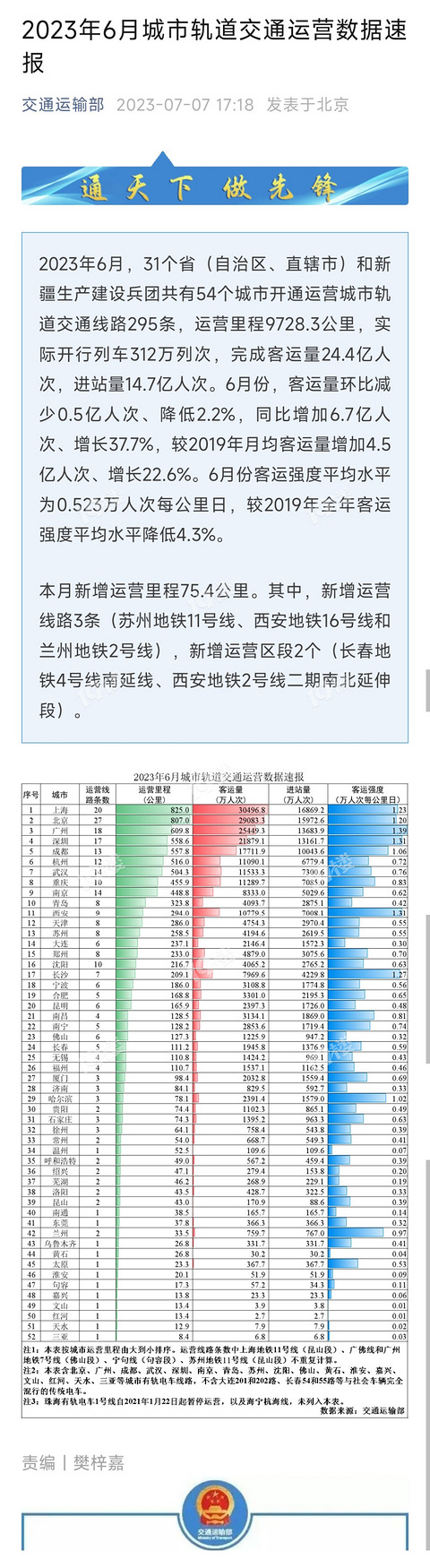 2023年6月城市轨道交通运营数据速报,嘉兴23.3万人次