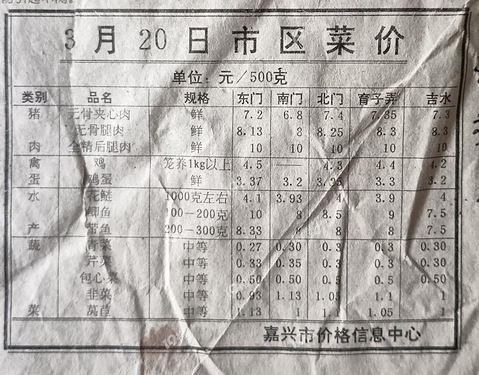又看到一份价目表,那是1995年3月20日的市区菜价。今天天气少许凉快,持续了两个月的高温终于缓和了,堆在书房里的一叠旧报纸也该要整理了。有一张报纸很泛黄还有破损,记得是在月河周日集市上买来的,价格肯定很便宜,当时买来是因为这是一份早期的《嘉兴日报周末版》,看期数才12期,日期是1995年3月25日星期六。这个日期,《南湖晚报》还没有试刊创刊。买来后,也没有细看,就和其他旧报纸放在了一起。今天当我