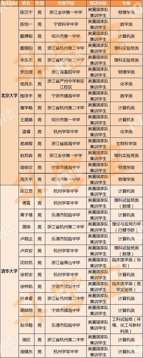 日前,清华大学、北京大学公布2021年保送生拟录取名单,共371人,其中北大193人,清华178人。记者仔细数了数,今年浙江有36名高三生保送北大、清华!浙江36名保送北大、清华的高三学生中,参加五大学科竞赛进入国家队集训后拿到保送资格的有29人,其中15名学生保送北大,14名学生保送清华: 从地域上看,这些学霸主要分布在杭州、温州、宁波、绍兴、金华。其中,杭州学子占了将近半壁江山。从学校来看,