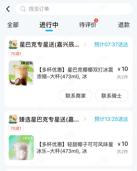 在外卖蓝色app上早上七点准时下单星巴克7.5一杯,两杯起购结合会员红包到手10元两杯早上跟老公一人一杯咖啡下午跟同事一人一杯星冰乐(早上下了预约单)真的太快乐啦!10元喝两杯