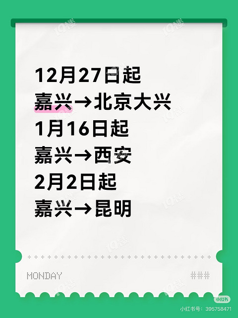 【12月10日最新:航线确认了!】据@嘉兴发布 ,2025年12月底前,嘉兴南湖机场将正式通航,首批开通至北京、成都、深圳、广州、长春5条客运航线;春节前夕再续开昆明、哈尔滨、重庆、西安、海口等5条客运航线。这10条航线将为嘉兴文旅市场辐射范围拓展注入强劲动能。 —— 划重点:嘉兴机场首批拟开通嘉兴至北京(大兴)、广州、深圳、成都(双流)、长春等航线,2026年春运将陆续开通哈尔滨、海口、重庆、西