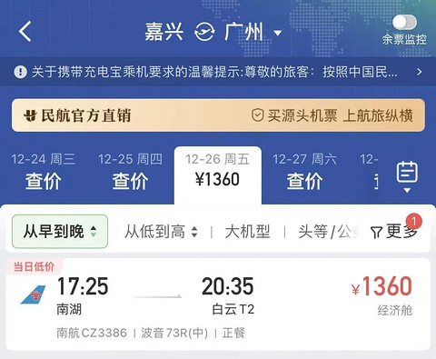 【更新】19楼网友反馈疑似为测试票,目前已经全没了 —— 嘉兴南湖机场首日飞北京机票太火爆了!都已经售罄了! 小编在航旅纵横APP查询发现嘉兴南湖机场飞广州的机票目前也已经开售票价为1360元起 记者查询看到,嘉兴至广州的航线12月26日起将开通,目前机票已经开售。 具体航班信息为,南方航空CZ3386计划17:25从嘉兴南湖机场起飞,20:35到达白云机场。 这条航线的开通,将进一步织密嘉兴