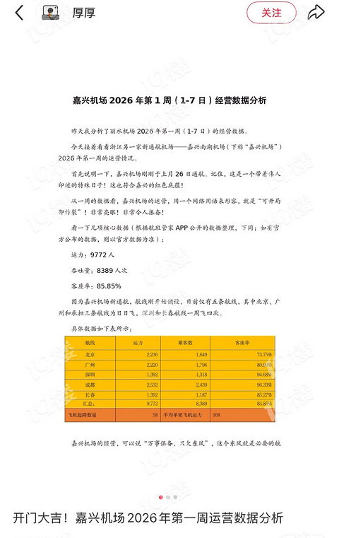 作为一个嘉兴人,家门口有机场了十分骄傲。但是也会担心坐的人不知道多不多,要是上座率低,以后航线、价格就会越来越没有优势了。看到这位博主的数据分析,总算放心了,成绩亮眼,开了一个好头! 以下内容来自于小红书博主厚厚: