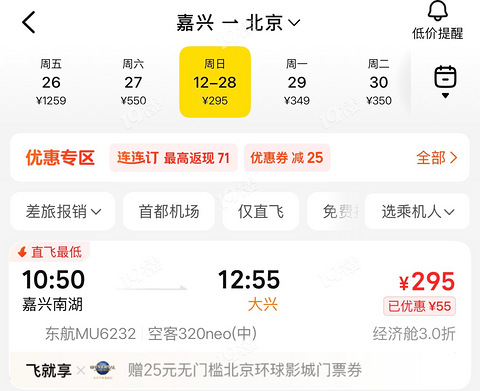 建议大家都去美团刷嘉兴机票!飞北京的300都不到了!降价蛮多