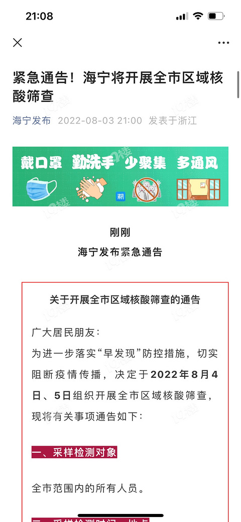 紧急通告!海宁明后两天开展全市区域核酸筛查!