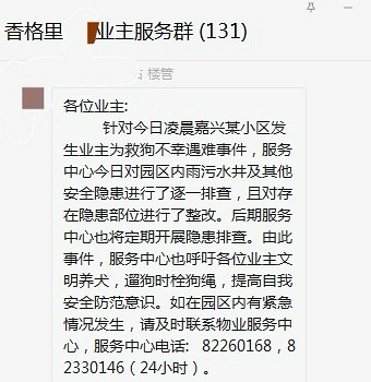 香格里物业针对业主救狗遇难事件做出反应:安全排查、隐患整改