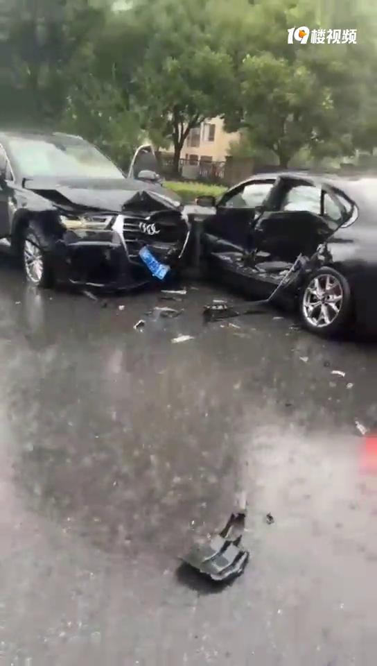 嘉兴暴雨天撞成报废,绝了!今天中午一宝马和奥迪车撞了!