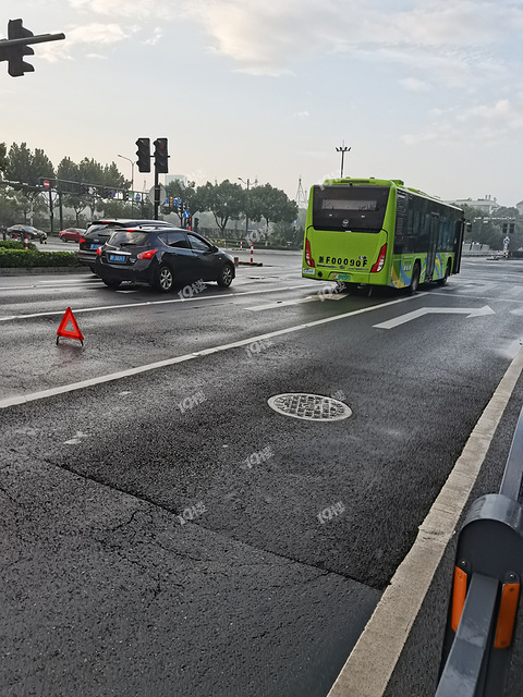海宁,公交车和集装箱车,发生交通事故。听说有人受伤。