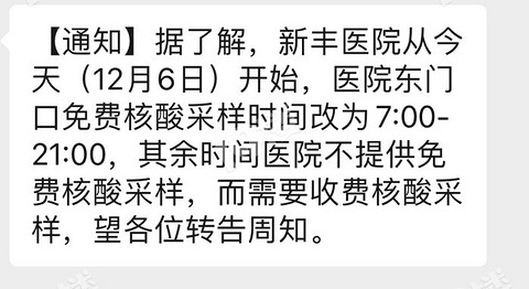 嘉兴之后核酸检测会不会收费啊?群里看到的,最近嘉兴的核酸检测点越来越少了,新丰通知 【通知】据了解,新丰医院从今天(12月6日)开始,医院东门口免费核酸采样时间改为7:00-21:00,其余时间医院不提供免费核酸采样,而需要收费核酸采样,望各位转告周知。