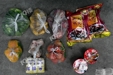 嘉善的物资包里有4只大鸡腿、两包酱鸭共两只、两桶方便面,小青菜两斤左右,5个大洋葱,一袋西红柿两斤左右,娃娃菜一包三棵,4个苹果。